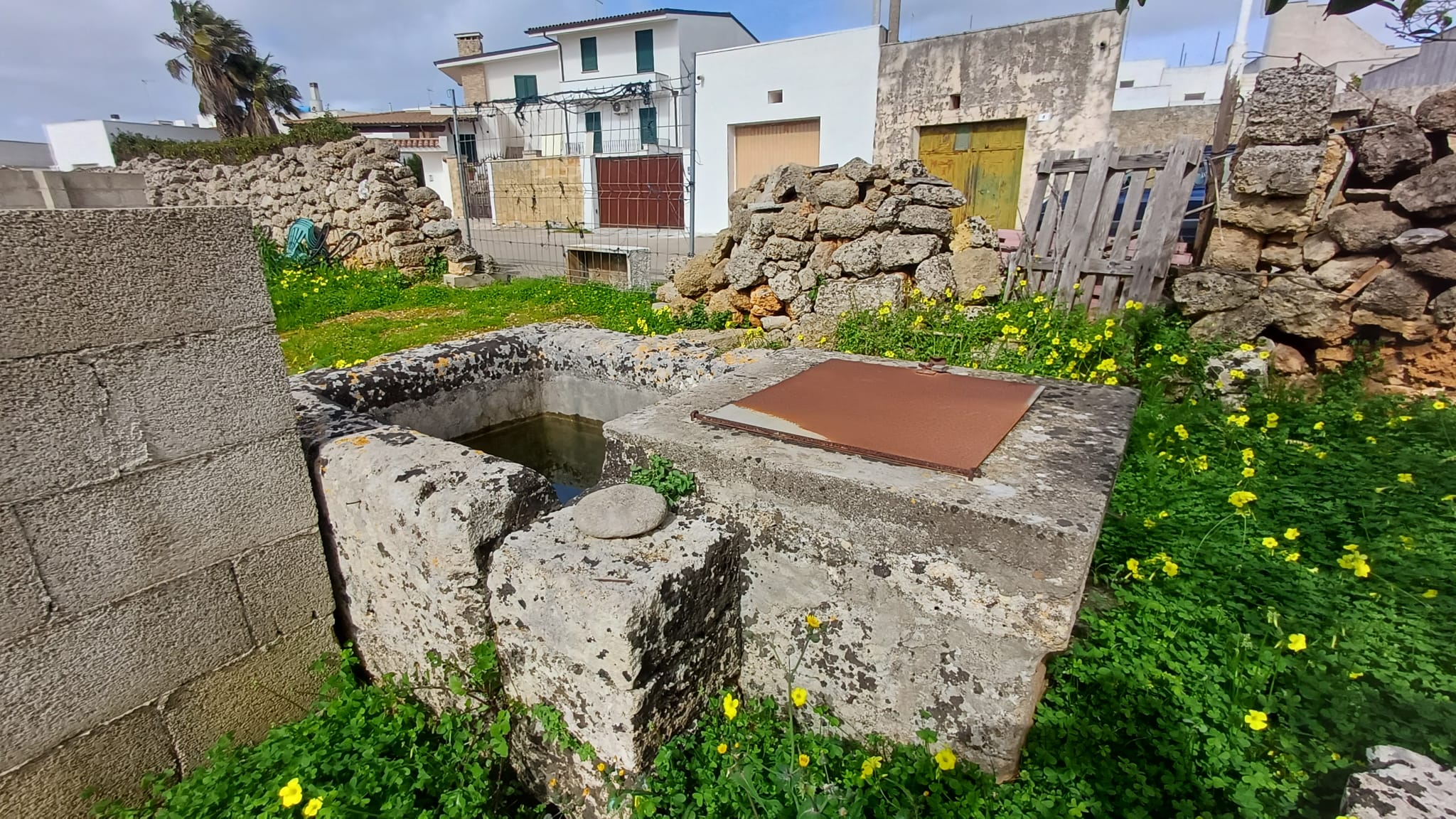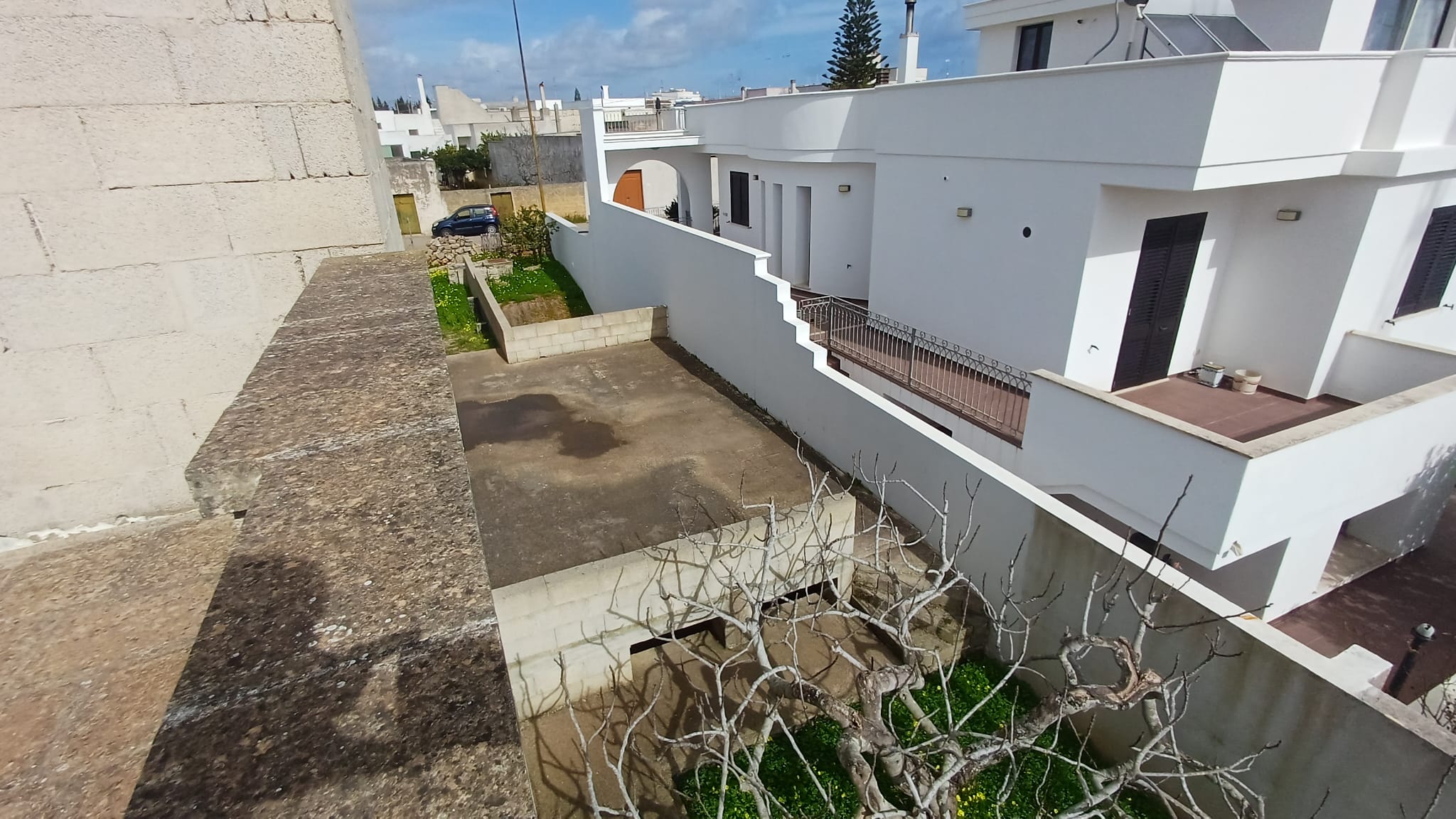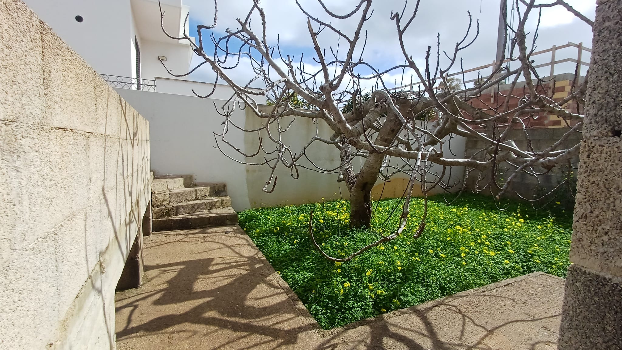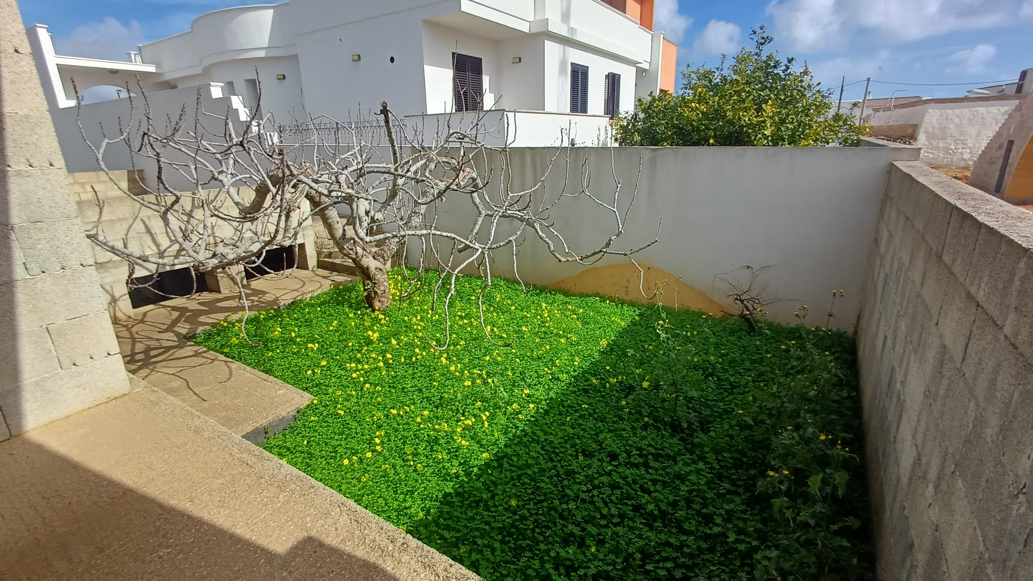 Scala di accesso al lastricato solare, cortile laterale ed ampio giardino con cisterna interamente recintato.