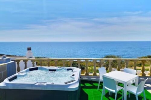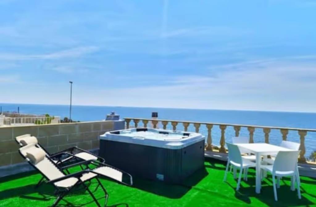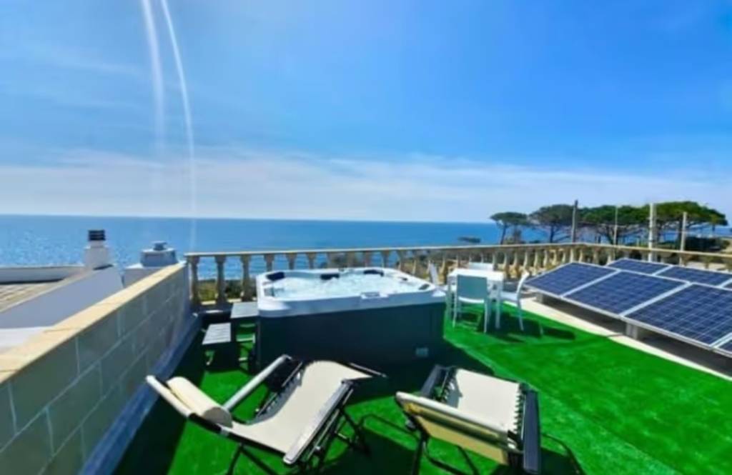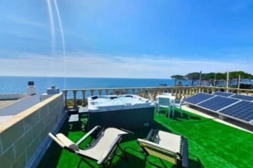 Cortile antistante, laterale e retrostante con barbecue e con scala esterna di accesso al lastricato solare attrezzato con vasca idromassaggio.
